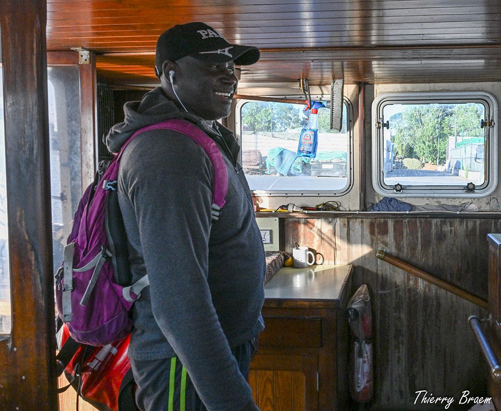 À l’arrière, Ousmane s’affaire près des chaluts encore enroulés — cet endroit encore endormi deviendra bientôt le cœur battant du bateau.
