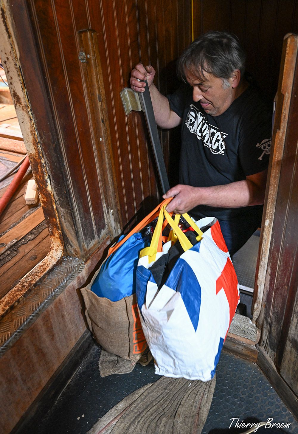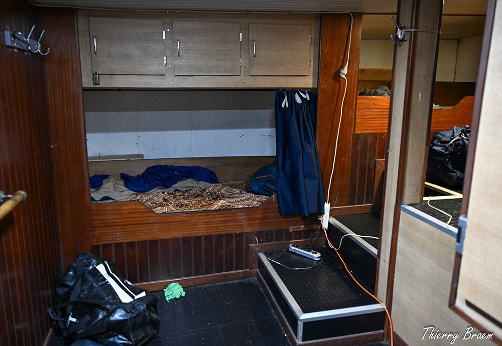 Un à un, ils montent à bord, leurs sacs d’effets sur l’épaule, le pas assuré. L’escalier étroit les avale, direction leur univers clos : couchettes, cuisine, sanitaires…