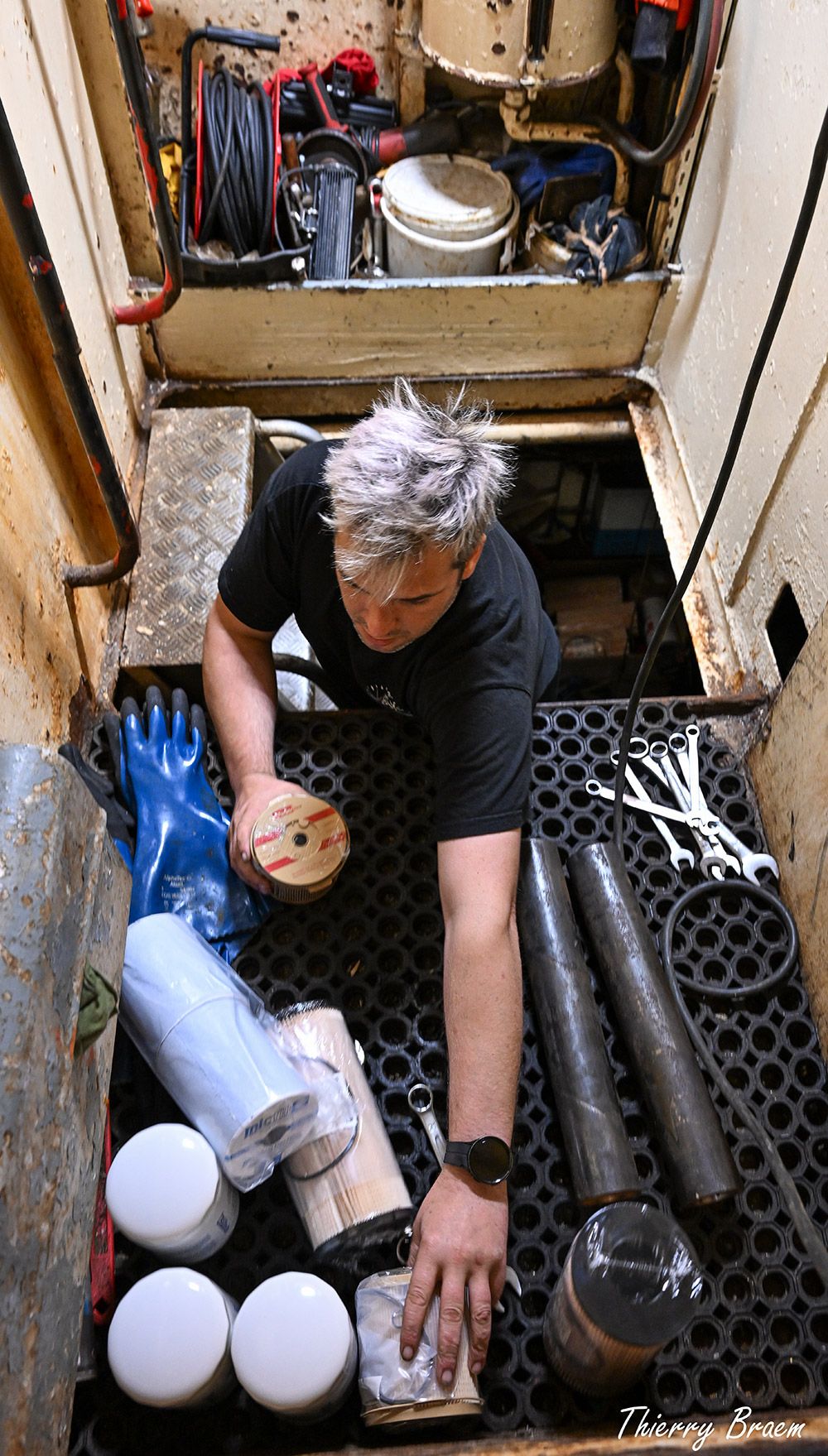 Dans les entrailles du navire, Andrés, le mécanicien, s’affaire déjà. Il inspecte, trie, prépare les pièces détachées : ici, rien ne doit être laissé au hasard.